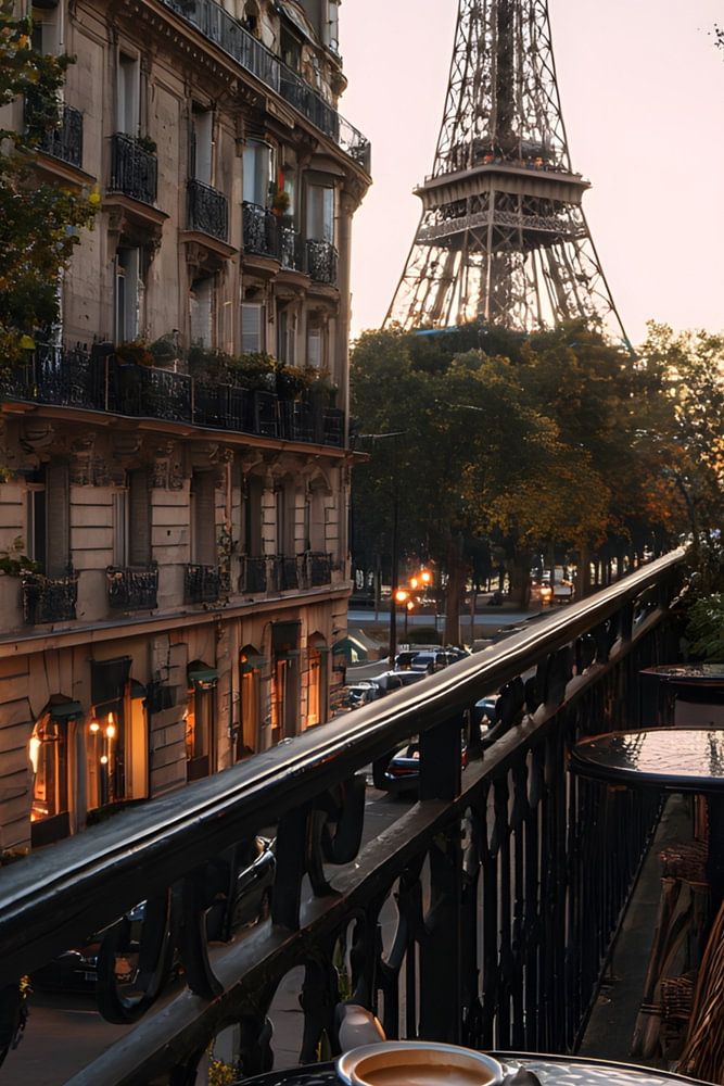 Das Foto zeigt eine Pariser Straßenszene bei sanftem Abendlicht. Vom schmiedeeisernen Balkon eines Cafés blickt man auf die eleganten Hausfassaden und die beleuchteten Geschäfte der Rue, während die Spitze des Eiffelturms prominent im Hintergrund aufragt. Auf dem runden Balkontisch steht eine einzelne Tasse Kaffee; daneben leere…