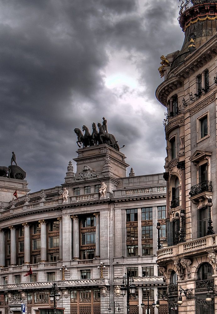 Donkere wolken boven Calle Alcala in Madrid kondigen een naderende regenbui aan. De historische gebouwen waaronder die van Edificio Banesto worden zo onderdeel van een dramatische scene.