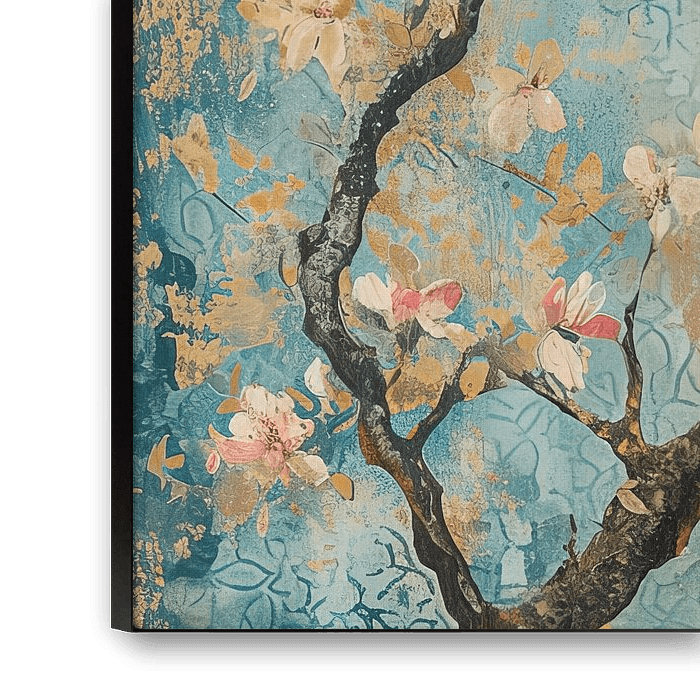 Soothing Blossom | Blossom Painting - Dieses Kunstwerk bringt einen zweiten Frühling in jeden Raum. Ein zarter Zweig mit Kirschblüten breitet sich anmutig auf einem Hintergrund aus beruhigenden Blautönen aus. Die subtilen Nuancen von Rosa und Gold im Kontrast zum Blau schaffen eine natürliche Farbpalette, die Wärme und Eleganz ausstrahlt. Dank der Harmonie zwischen den organischen Linien und dem strukturierten Design passt er sowohl in klassische als auch in ländliche Interieurs und bringt ein Stück Natur in moderne Wohnumgebungen.