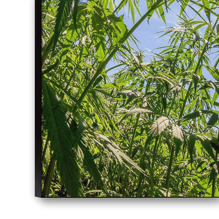 Ein Feld mit Marihuana oder Hanf Pflanzen mit blauem Himmel und Sonne im Hintergrund