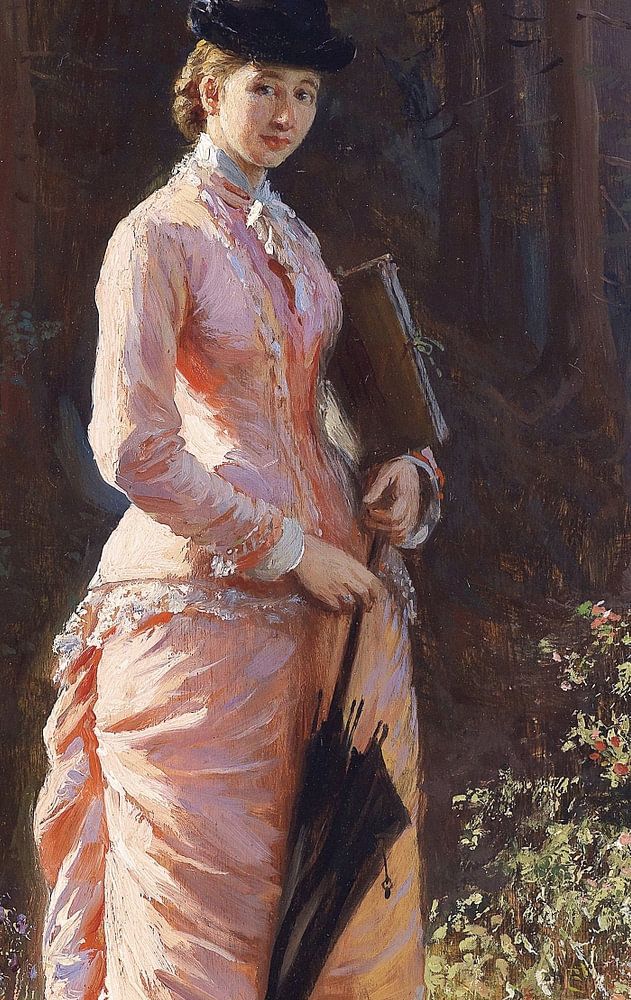 Diese adrett gekleidete Frau hat eine Mappe mit Zeichnungen unter dem Arm, während sie in ihrem schicken rosa Kleid bei Sonnenschein einen Waldweg entlanggeht.