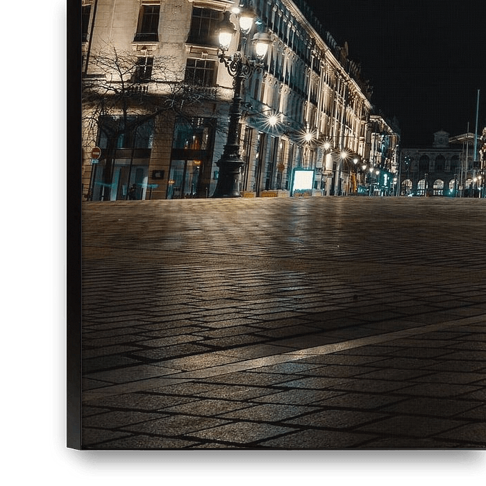Nächtliche Ansicht des Opernplatzes in Lille, mit der Rue Faidherbe auf der linken Seite (die Straße, die zum Bahnhof Lille-Flandres führt) und der Rue Pierre Mauroy auf der rechten Seite.