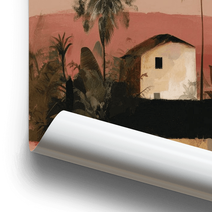 Eine tropische Szene voller Frieden und Wärme. Ein einfaches Haus steht versteckt zwischen Palmen und üppigen Pflanzen, während die Sonne langsam hinter dem rosa Schein des Horizonts versinkt. Im Wasser spiegeln sich die Farben des Abends, und ein Vogel ruht auf einer Palme, als ob die Welt für einen Moment still stünde. Dieses Werk…