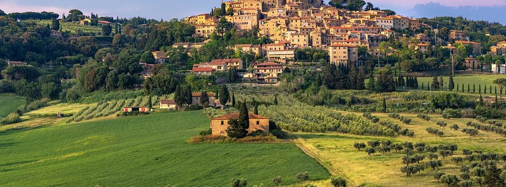 Die italienische Provinz Toskana bietet wunderschöne Landschaften und Ausblicke. Besonders beliebt sind hier die sanften Hügel mit den hoch aufragenden Dörfern. Darüber hinaus wird die Landschaft von ikonischen Olivenbäumen, Zypressen und Weinbergen geprägt. Auf diesem Foto sehen wir einen Panoramablick auf die Stadt Casale Marittimo.