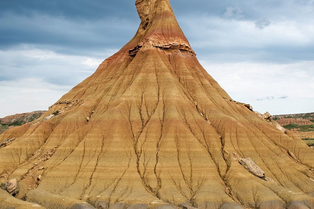 dunkle Wolken und Regen als Hintergrund der Felsformation Castildetierra im Gebiet Bardenas Blanca des Naturparks Bardenas Reales, Navarra, Spanien