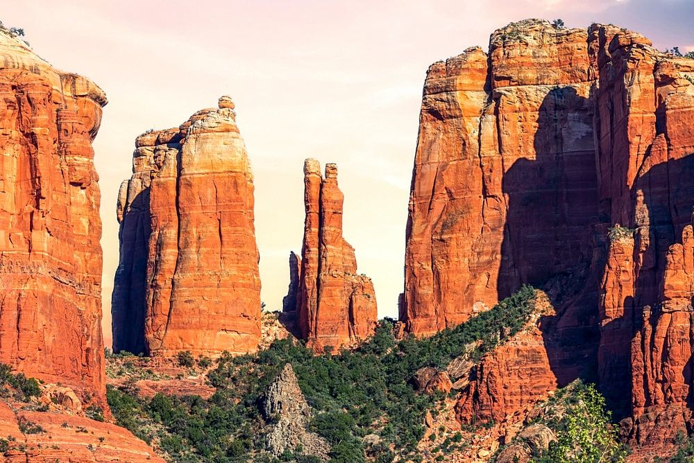 Ein Blick auf den Cathedral Rock im atemberaubend schönen Sedona, Arizona. Majestätische rote Felsformationen erheben sich über einem üppigen grünen Wald, und ein leuchtender Sonnenuntergang verleiht der Szene Wärme. Die hoch aufragenden Felsstrukturen schaffen eine dramatische und beeindruckende Landschaft.
