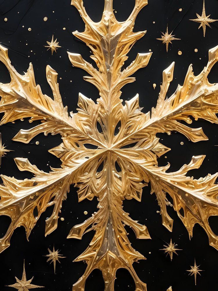 "Celestial Flake - Baroque Winter Glamour" ist ein majestätischer Vertikaldruck voller goldener Details, perfekt für alle, die luxuriöse Kunst mit einem ausgefallenen Touch lieben. Dieser festliche Blickfang aus der Glamas Collection zeigt eine barocke Schneeflocke, die vor einem tiefschwarzen Hintergrund schimmert, umrahmt von auffächernden Goldsternen und kräftigen Pinselstrichen, die an ein Feuerwerk erinnern.