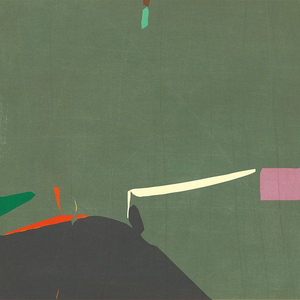 Ein Meisterwerk, das zeitgenössische musikalische Abstraktion und geometrische Komposition verkörpert. Die Leinwand steht vor einem gleichmäßigen olivgrünen Hintergrund, der die schummrige, konzentrierte Atmosphäre eines Konzertsaals symbolisiert. Im Vordergrund verflechten sich scharfe und dynamische geometrische Flecken: ein großer…