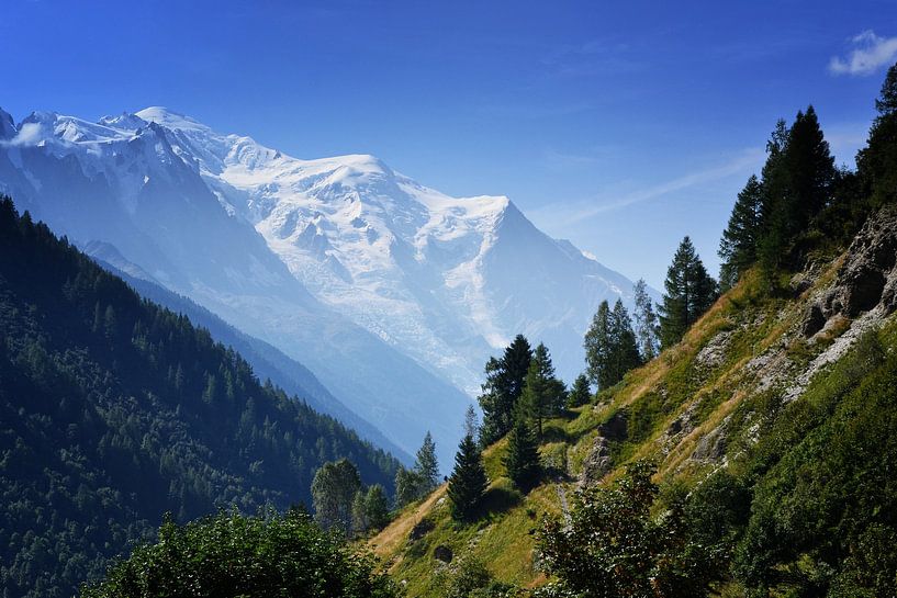 Blick auf den Mont Blanc, den höchsten Berg der Alpen und Westeuropas, in der Nähe von Chamonix, Frankreich, an einem dunstigen Sommertag.