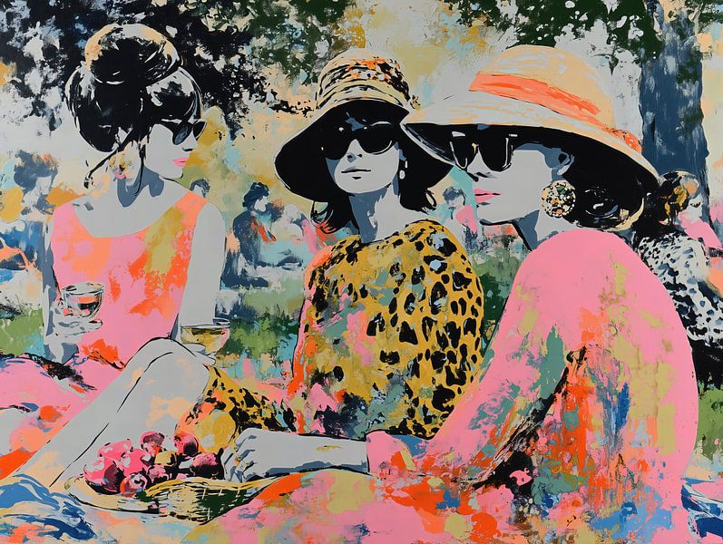 Ein lebendiges, zeitgenössisches Porträt von drei stilvollen Frauen, die ein sonnendurchflutetes Beisammensein im Garten genießen. Ausdrucksstarke Pinselführung und kräftige Farbkontraste vermitteln Eleganz, Muße und moderne Weiblichkeit.