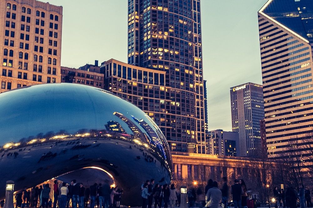 Chicagoer Wolkenkratzer am Abend mit Sphere-Skulptur