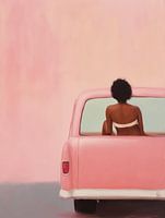 Chillen auf der Rückbank des Autos. Ein besonderer Blickfang für Ihr Interieur! Porträt einer Frau, von hinten gesehen, auf dem Rücksitz eines rosa Autos.