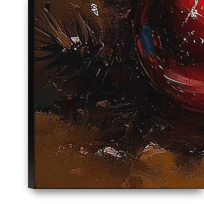 Pracht der Weihnachtskugeln - Dieses Weihnachtsgemälde zeigt fünf große, glänzende Kugeln in den Farben Rot, Blau und Orange, die durch einen Hintergrund aus Tannenzweigen und kleinen roten Beeren ergänzt werden, die allesamt mit Farbklecksen bedeckt sind, die an Schneeflocken erinnern.