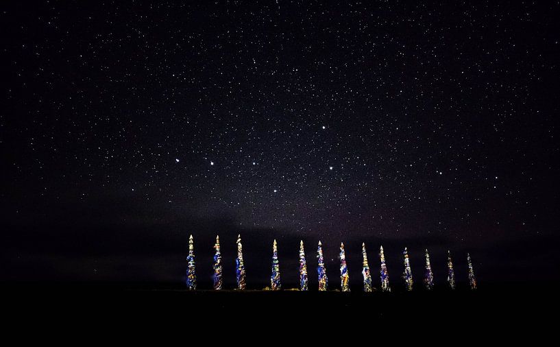 Eine Reihe schamanischer Totempfähle mit bunten Bändern unter einem klaren Sternenhimmel in der Nähe des Dorfes Chuschir auf der Insel Olchon, die mitten im Baikalsee in Russisch-Sibirien liegt.