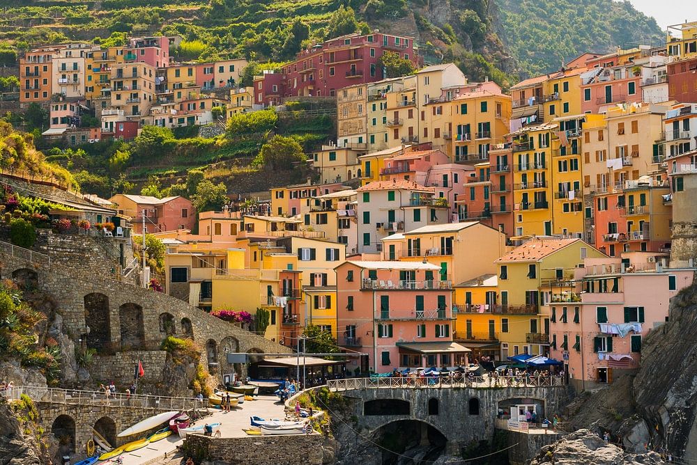 Cinque Terre, der Name sagt es schon: Fünf Dörfer an der italienischen Küste bei Spezia in Ligurien. Auf diesem Bild sehen Sie eines der fünf Dörfer. Die fünf Dörfer stehen auf der UNESCO-Liste und sind alle sehr schön und die Farben sind kennzeichnend.