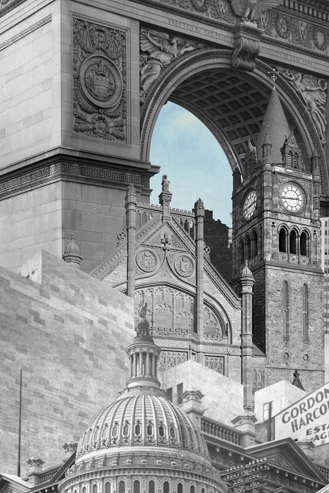 Collage aus verschiedenen alten Schwarz-Weiß-Fotografien von Gebäuden und Denkmälern.