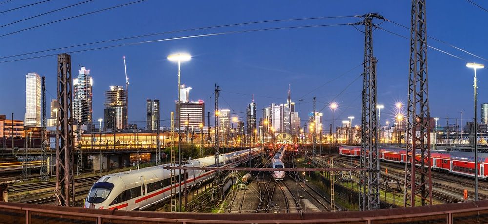 Die Skyline der Bankenmetropole Frankfurt/ Main, mit dem Gleisvorfeld des Kopfbahnhofes zur blauen Stunde