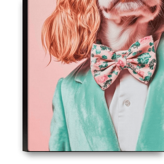 In einem pastellfarbenen Rahmen präsentieren sich die eleganten Züge eines Clumber Spaniels, der mit seiner glamourösen Sonnenbrille und dem stilvollen Anzug zum echten Hingucker wird. Das sanfte, gewellte Fell und die treuen Augen strahlen einen Hauch von Luxus und Charme aus, während das florale Fliegenband einen verspielten Akzent…