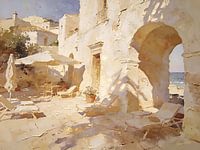 Tauchen Sie ein in den strahlenden Charme des Mittelmeers mit diesem faszinierenden Gemälde aus der Kollektion „The Mediterranean – Romantic Shoreline Series“. Ein sonnenverwöhnter Dorfhof erwacht mit strahlender Energie zum Leben, wo strahlend weiße Gebäude und anmutige Torbögen im warmen Sonnenlicht baden. Scharfe, verspielte Schatten…
