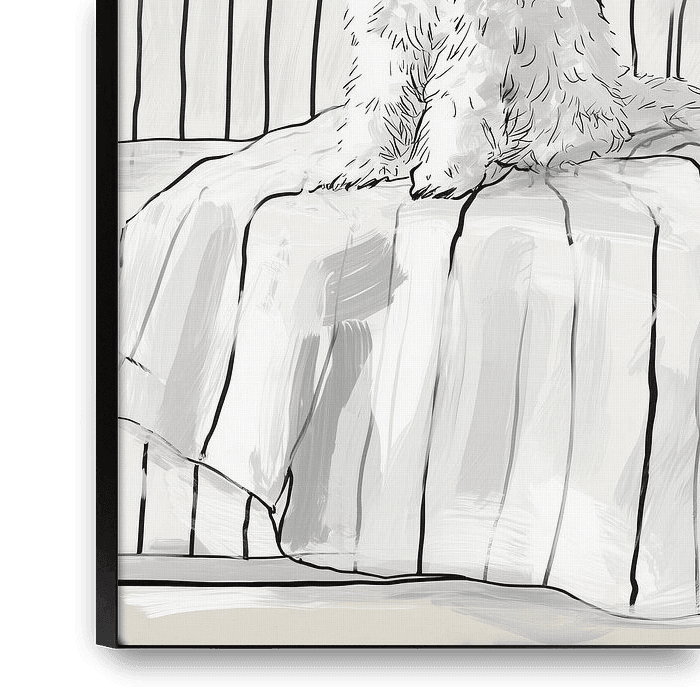 Diese minimalistische Illustration zeigt einen süßen Cockapoo, der ruhig auf einer Bank sitzt. Die weichen Linien und subtilen Details im Fell verleihen dem Porträt eine warme und einladende Ausstrahlung. Durch die Verwendung ruhiger, neutraler Farbtöne entsteht ein ruhiges und zeitloses Bild, in dem der Hund im Mittelpunkt steht. Der…