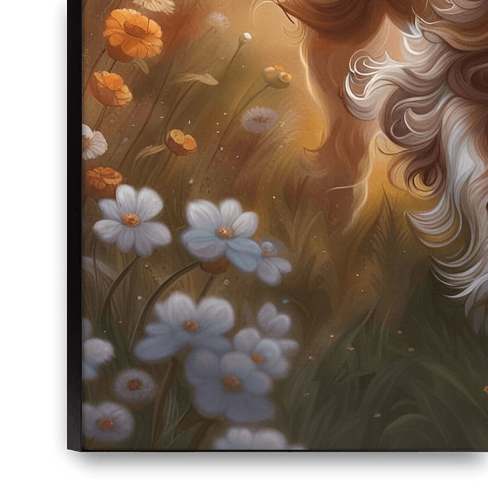 Bestelle das digitale Kunst Bild Cocker Spaniel spielt in einem Blumenfeld von Johannas Art Creations als Reproduktion auf Leinwand, Alu-Dibond, als Poster, Fototapete oder Acrylglasbild.