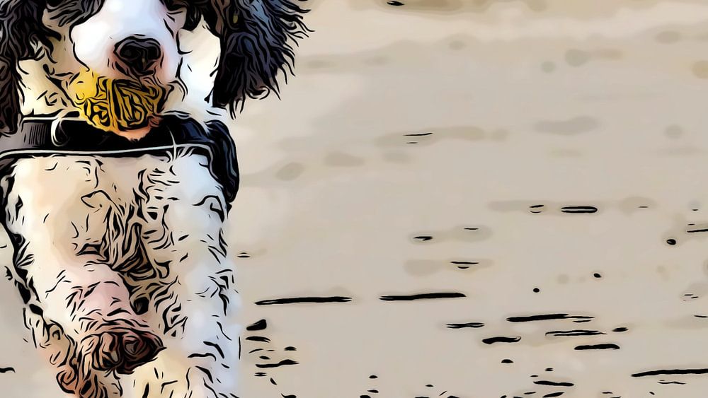 Ein weißer Cocker Spaniel am Strand beim Zeichnen