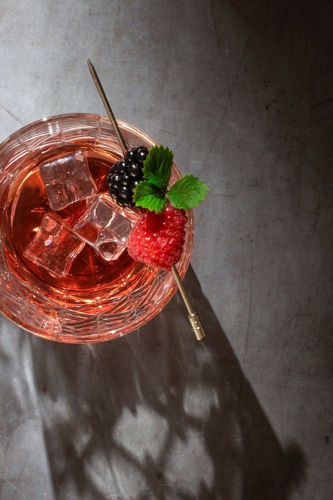 Atmosphärisches Flatlay von frischen Cocktails mit einem schönen Schlagschatten auf grauem Hintergrund. Dieses Bild passt perfekt in ein Restaurant, eine Bar oder eine Küche.