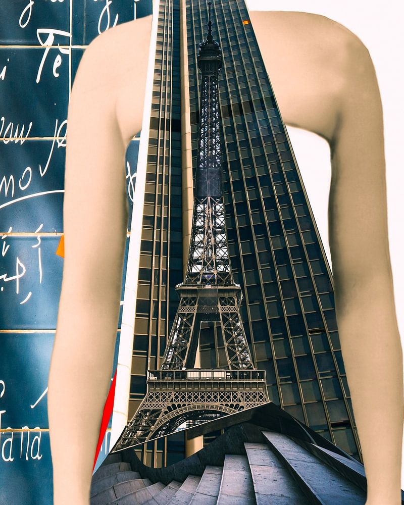 Diese Fantasie-Collage einer Frau mit Hut, gekleidet in Eiffelturm, Tour Montparnasse und Treppenhaus wurde von mir für meine Mitgliedschaft in der Paris Collage Collection erstellt.