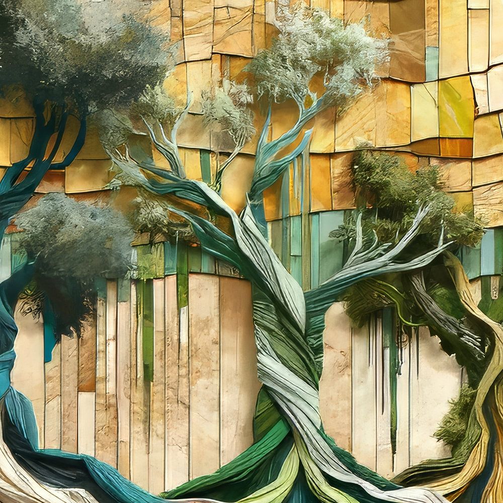 Digitale Collage. Thema: Fromager-Bäume in einer senegalesischen Waldlandschaft. Der Hintergrund sieht aus wie geklebtes Papier. Die Bäume erscheinen in 3D.