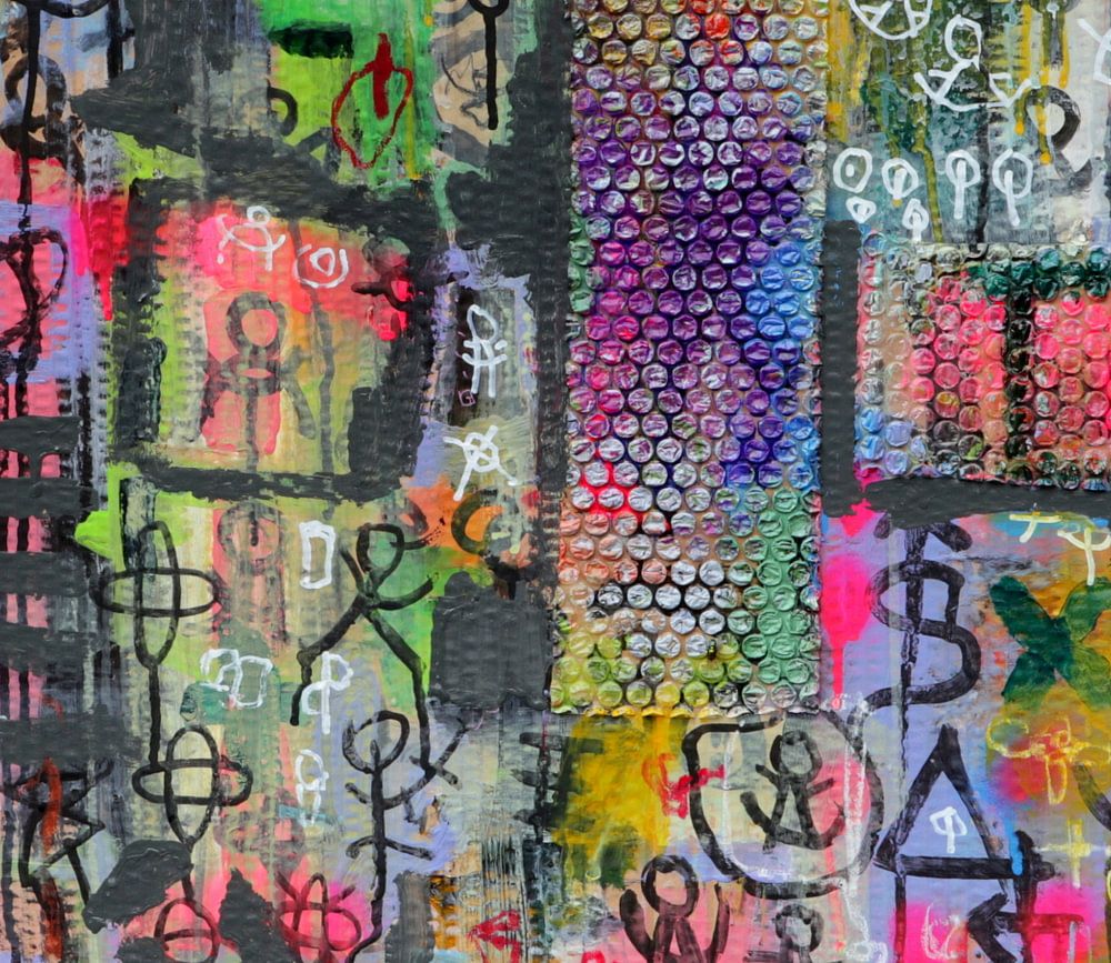 Buntes Collage-Artwork im Streetart-Design mit Luftpolsterfolie.