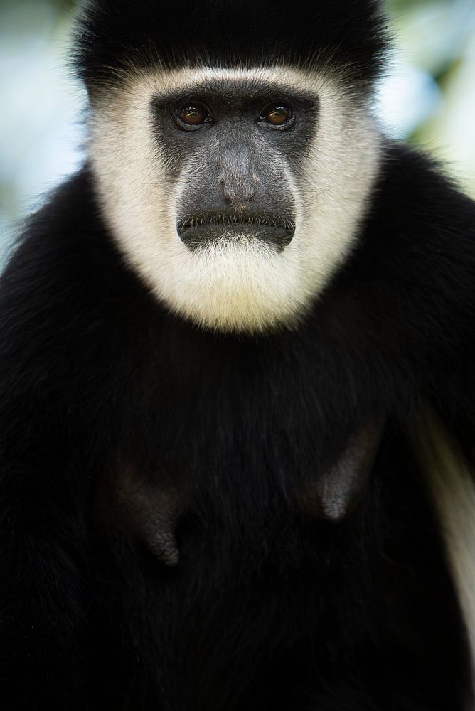 Colobus-Affen, auch Östliche Fransenäffchen genannt, haben ein schwarzes Fell, das einen schönen Kontrast zu ihrem weißen Mantel, Schwanz und Bart bildet.