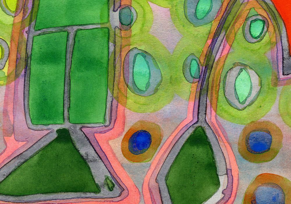 In this cheerful abstract image three prominent colorful shapes are surrounded by small circles. All shapes are embedded into a color gradient. The overall impression is reminding at beautiful kites at a beach.