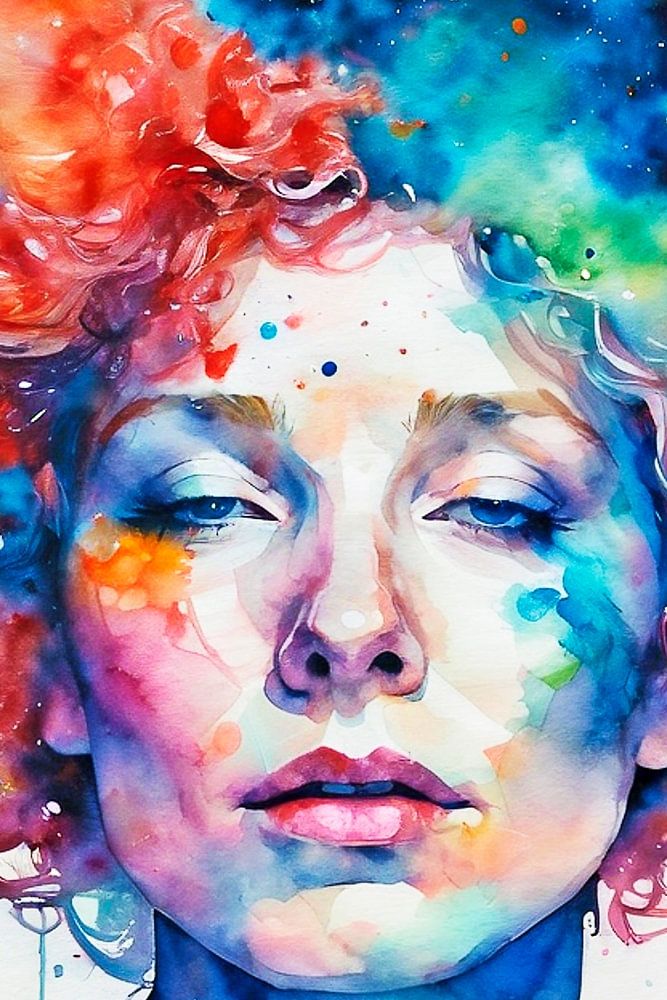 Dieses Porträt ist eine außergewöhnliche Frontalansicht. Die Frau hat geschlossene Augen und wirkt sehr in sich gekehrt. Ihr Kopf ist von einer explosiven Wolke aus leuchtenden Rottönen und blauen Farbspritzern umgeben, die fast wie eine Aura wirken. Die Farbspuren auf ihrem Gesicht, die von den Augen nach unten fließen, verstärken den meditativen Ausdruck und symbolisieren eine tiefe emotionale Erfahrung.