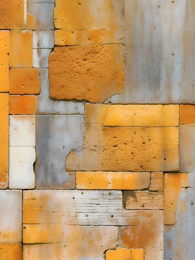 Dieses Werk zeigt eine abstrakte Komposition aus verwittertem Stein und Beton, wahrscheinlich eine Mauer, die im Laufe der Zeit abgebaut wurde. Die Oberfläche weist ein vielfältiges Farbspektrum auf, mit warmen Gelb-, Orange- und Grautönen. Einige Steine sind glatt und symmetrisch, während andere rau und uneben sind, was einen interessanten Kontrasteffekt ergibt. Das Ganze erinnert an ein Patchwork, bei dem natürliche und menschliche Elemente zusammenkommen.
