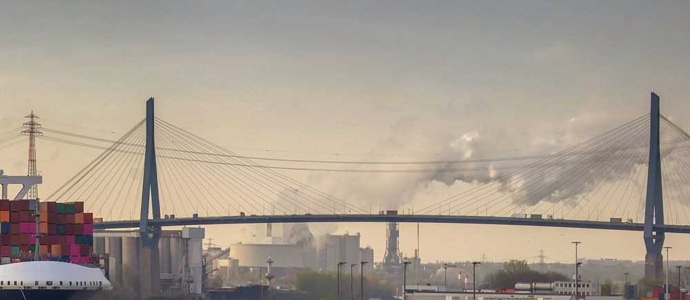 Dieses Bild zeigt ein großes Containerschiff, das von einem Schlepper durch die Wasserwege des Hamburger Hafens navigiert wird. Im Hintergrund erhebt sich die beeindruckende Köhlbrandbrücke, die ein Wahrzeichen der Stadt darstellt. Die Szenerie ist geprägt von industriellen Elementen wie Kränen, Containern und Fabrikgebäuden, aus denen Rauchwolken aufsteigen, und vermittelt die geschäftige Atmosphäre des globalen Handels. Dieses Bild eignet sich hervorragend für Themen rund um Logistik, Transport, Schifffahrt und Infrastruktur. Es weckt Assoziationen von Bewegung, Effizienz und wirtschaftlicher Vernetzung, ideal für kommerzielle und redaktionelle Zwecke in der Transport- und Industriebranche.