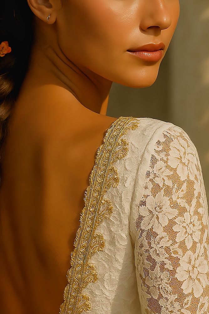 Eine Sommerschönheit mit langem kastanienbraunem Haar, das zu einem Zopf geflochten und mit kleinen bunten Blumen geschmückt ist. Sie trägt ein elegantes Spitzenkleid mit langen Ärmeln und einem tiefen Rückenausschnitt, der mit goldenen Details verziert ist. Die Frau blickt über ihre Schulter, mit einem sanften Gesichtsausdruck, der die warme Eleganz einer mediterranen Küstenstadt ausstrahlt. Im Hintergrund blüht eine gelbe Bougainville an der Säule.