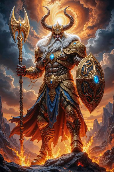 In einer Szenerie von monumentaler Wucht erhebt sich eine göttliche Gestalt zwischen Feuer und Himmel. Der verstoßene Gott der Wikinger steht auf zerklüftetem Gestein, während lodernde Flammen unter seinen Füßen aufbrechen und ein gewaltiger Strudel aus Licht den Himmel hinter ihm durchzieht. Seine mächtige Rüstung glänzt in edlem Gold,…