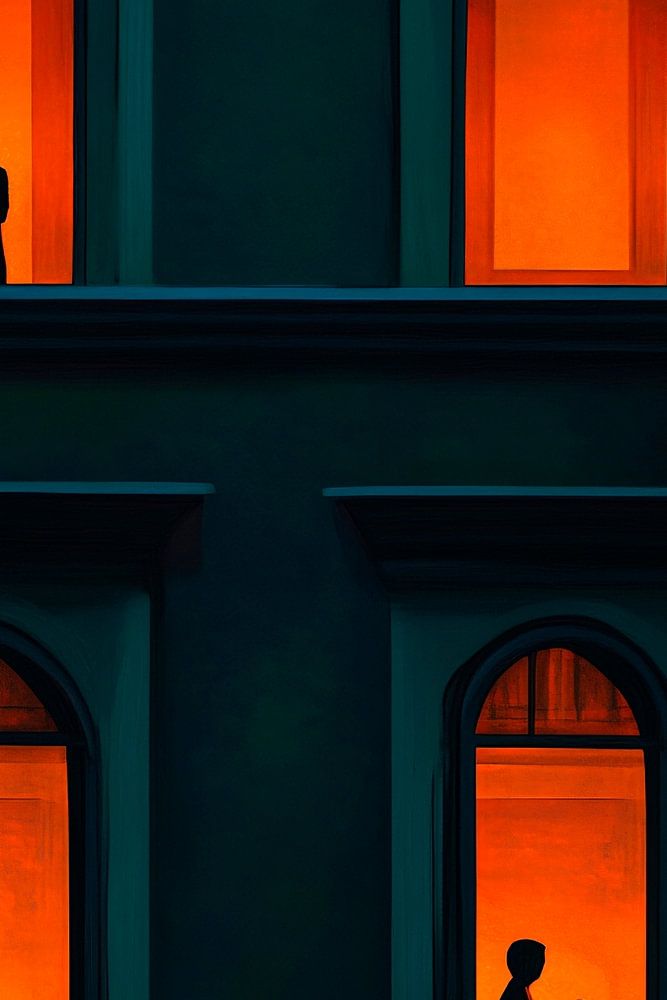 Ein geheimnisvolles Spiel von Licht und Schatten entfaltet sich in dieser urbanen Kulisse. Die warmen, orangefarbenen Fenster strahlen eine einladende Wärme aus, während die Silhouetten der Figuren geheimnisvoll und nachdenklich wirken. Das Bild eignet sich perfekt für das Wohnzimmer, wo es eine Atmosphäre des Staunens und der Reflexion schafft.