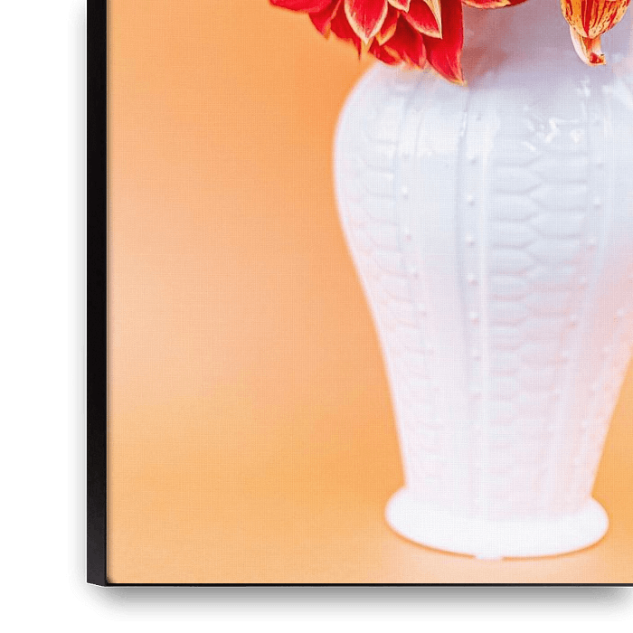 große Dahlienblüten in verschiedenen Rot-, Orange- und Gelbtönen in einer altmodischen weißen bauchigen Vase vor orangefarbenem Hintergrund