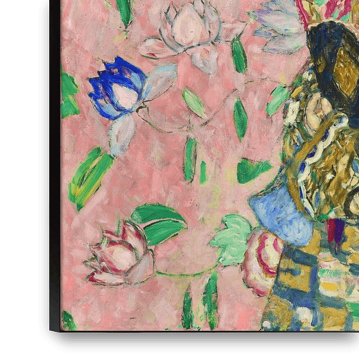 Bestelle Dame mit Fächer, Gustav Klimt (hellrosa, digital vergrößert) als Reproduktion auf Leinwand, Alu-Dibond, als Poster, Fototapete oder Acrylglasbild.