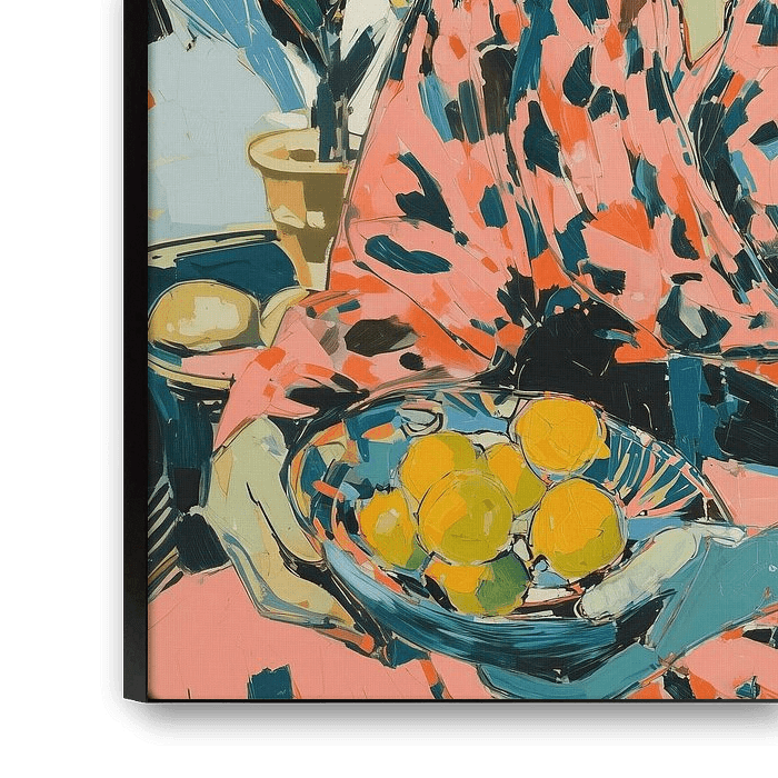 Ein modernes Porträt einer Frau in kräftigen Korallentönen, die eine Schale mit Zitronen hält. Das mit dicken, ausdrucksstarken Spachtelstrichen geschaffene Kunstwerk vereint Eleganz und Emotionen in einem zeitgenössischen abstrakten Stil