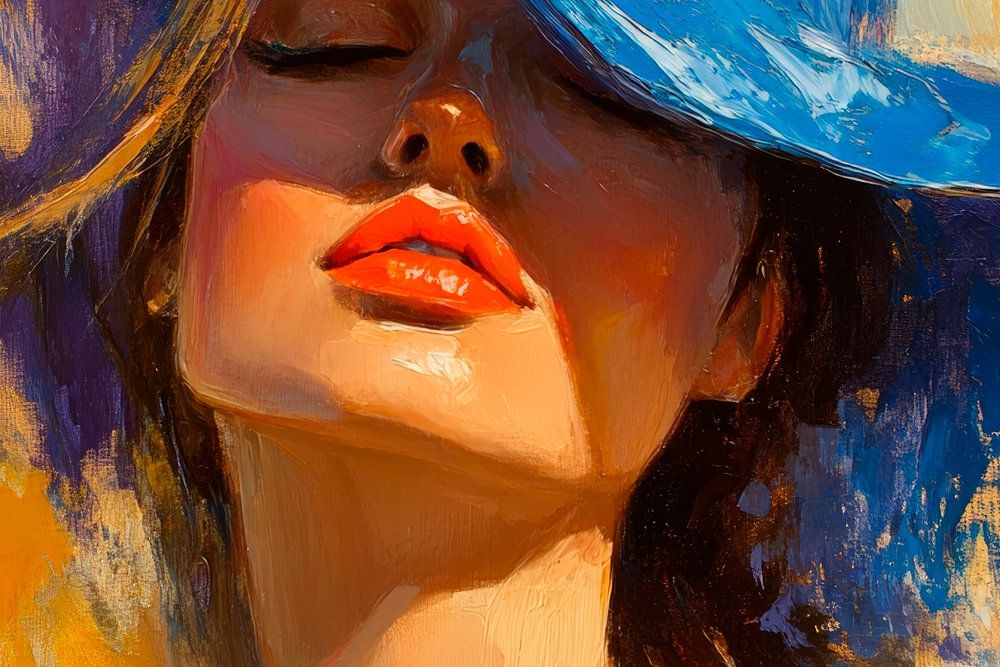 Leuchtende Farben und entspannte Eleganz fangen den Moment der Zuflucht unter einem großen blauen Hut ein. Die strahlenden Lippen und die sanften Pinselstriche schaffen eine Aura der Gelassenheit und Lebensfreude. Dieses Kunstwerk verleiht jedem Wohnzimmer einen Hauch von Luxus und lässiger Raffinesse, ideal für entspannte Gespräche.