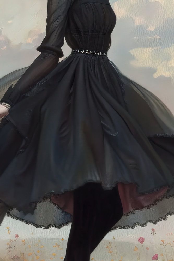 Womenswear | Dark Elegance Blooms - Dieses Gemälde für Frauen zeigt eine anmutige Dame in einem eleganten schwarzen Kleid inmitten eines vielfarbigen Blumenfeldes, in dem Schmetterlinge vor einem sanft getönten Himmel flattern.