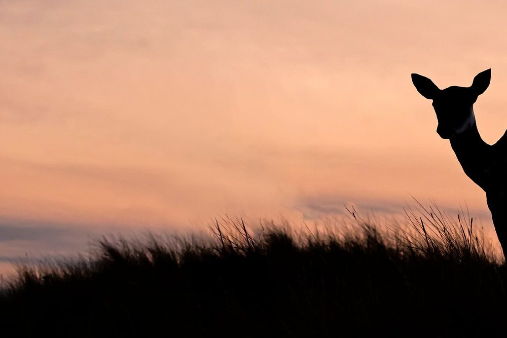 Silhouette eines Damhirsches (Dama Dama) bei Sonnenuntergang