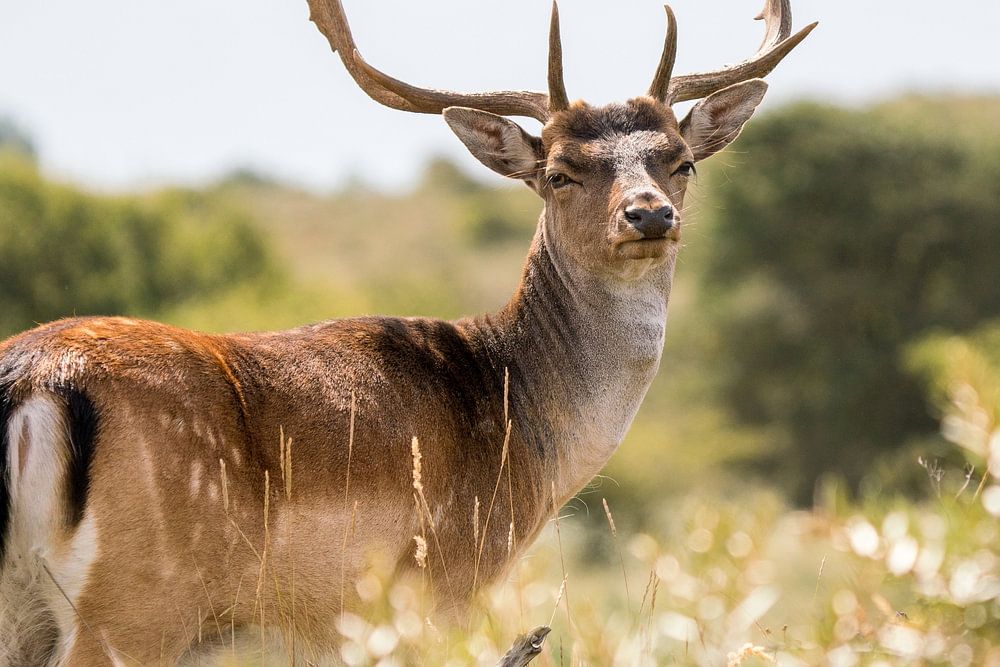 Dieser Damhirsch mit Geweih spaziert durch die Dünen. Dieses Foto wurde an der niederländischen Küste in der Nähe von Zandvoort in Meeresnähe aufgenommen.
