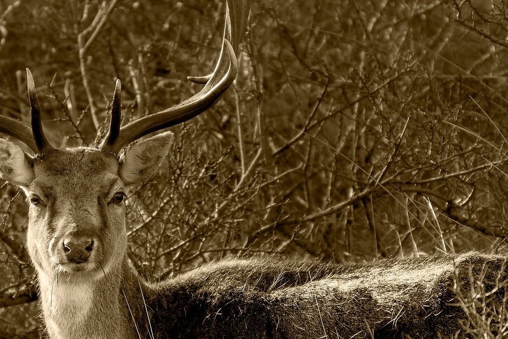 Dieser Damhirsch hat ein wachsames Auge auf den Fotografen. Fotografie in schwarz-weiß, sepia.