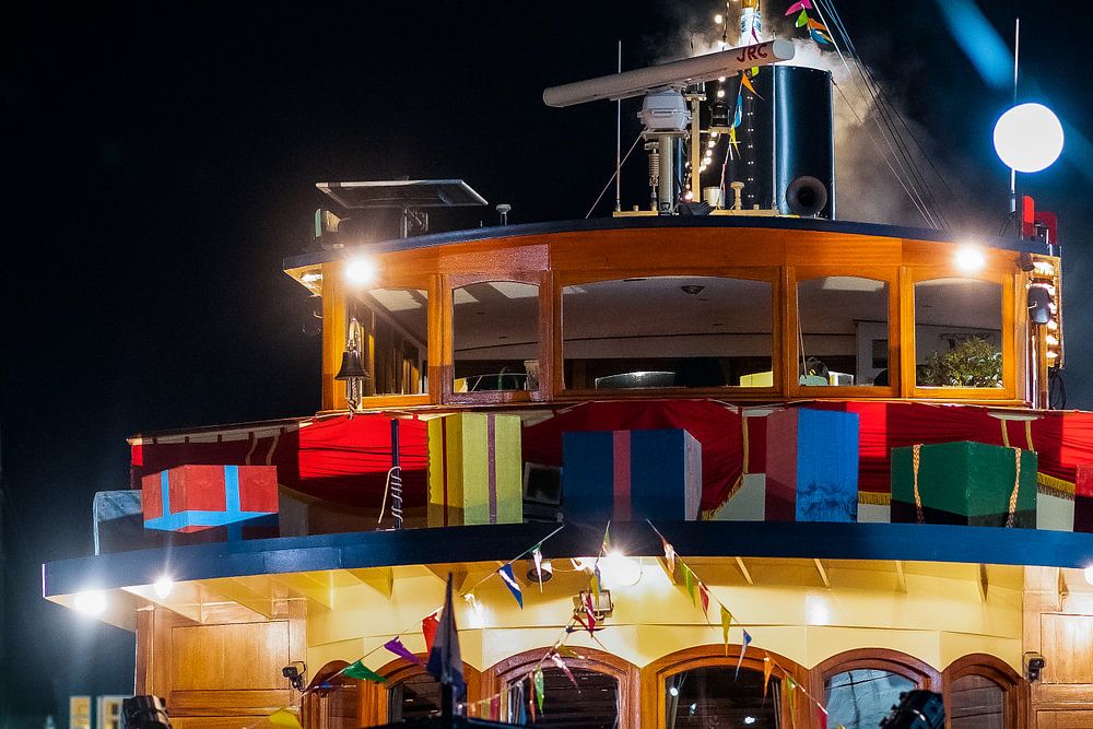Klassisches Beispiel für ein typisches Sinterklaas Paketboot. Alter Dampfer am Kai eines Hafens während der jährlichen Einfahrt des Sint en Zwart Piet in eine Stadt oder ein Dorf irgendwo in den Niederlanden. Geschmackvoll dekorierter und beleuchteter Dampfer während und abendlicher Eintritt im Dezember.