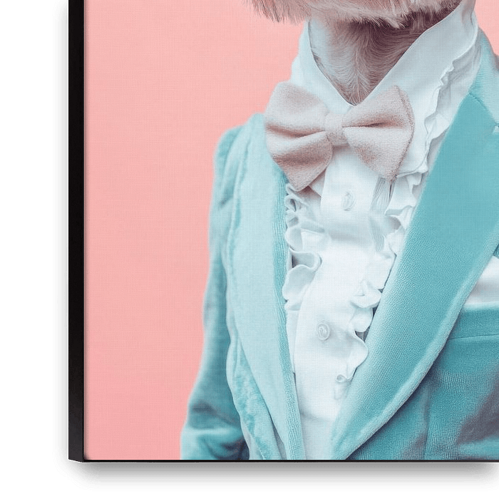 In schickem hellblauen Anzug strahlt der Dandie Dinmont Terrier eine charmante Eleganz aus. Sein kuscheliges, welliges Fell und die ausgeprägten, freundlichen Augen verleihen ihm einen fast königlichen Ausdruck. Ein zierlicher Schlips rundet das Gesamtbild ab und macht ihn zum absoluten Showstar in dieser verspielten Inszenierung.