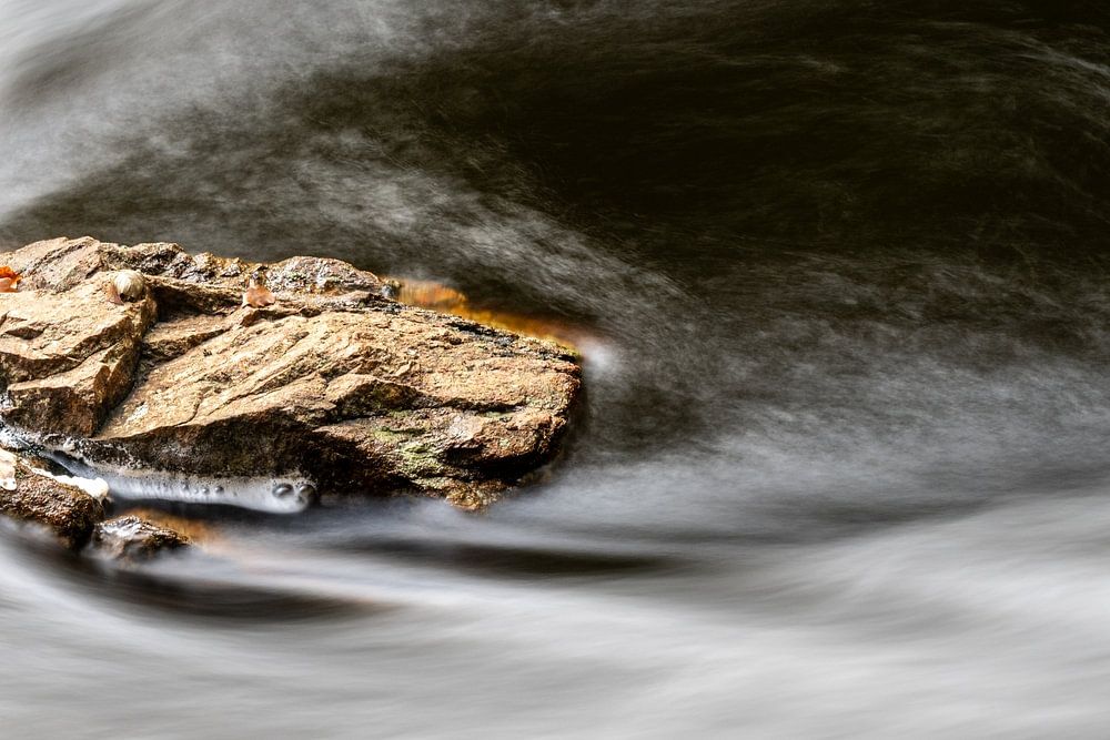 Die Wasserströmungen in diesem Gebiet erzeugen Muster, die sich wie Gemälde über die Felsen ziehen. Das Wasser glitzert in der Sonne und scheint in perfekter Harmonie mit den Farben des Herbstes zu tanzen. Jede Biegung des Flusses offenbart neue Texturen und Farben, die den Weg durch den Wald faszinierend und voller Überraschungen machen. Die Luft riecht nach Kiefern und feuchter Erde, und das Herbstlaub überzieht die Wege mit einem bunten Teppich.