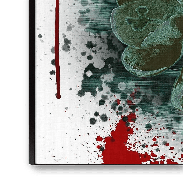 Im Zentrum des Kunstwerks öffnen sich dunkelgrüne, fast metallisch wirkende Blüten vor einem tiefen Hintergrund aus sattem Schwarzgrün. Umgeben werden sie von einem dynamischen Spiel aus Farbexplosionen, feinen Tintenstrukturen und dezent verlaufenden roten Tropfen, die an verblasste Emotionen erinnern.